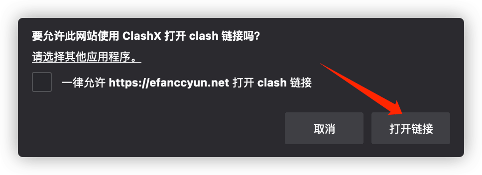 2.3.点击一键导入后会弹出下图窗口点击打开链接。然后自动弹出clash点击确定即可。