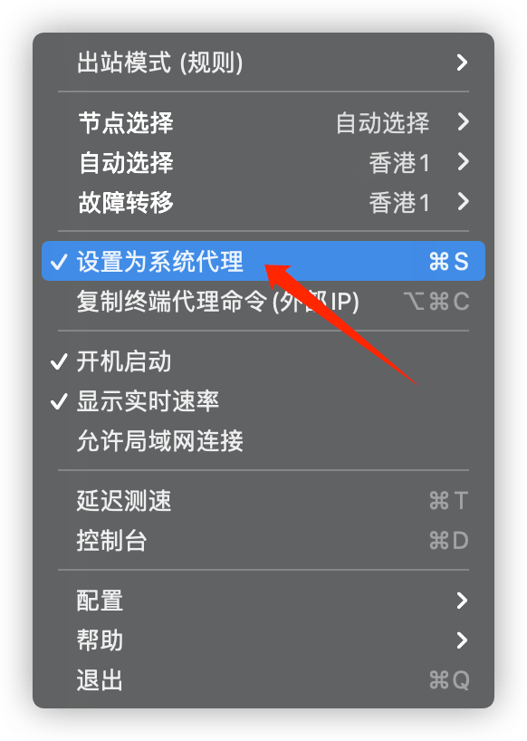 ⚠️找到软件图标 右击点击 设置为系统代理 (有勾 ☑️ 则为开启再点击一次 则为 关闭(此时无☑️)